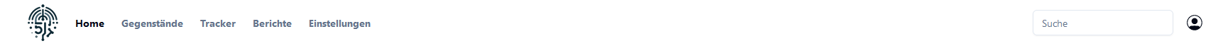 Die Hauptnavigation bietet Links zu den einzelnen Unterpunkten Home (Dashboard), Gegenstände, Tracker, Berichte und Einstellungen. Ausserdem bietet es eine Suche und das Benutzermenu.