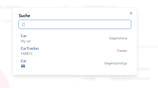 Folgende Daten werden für die Suche indexiert: Gegenstände, Tracker, Gegenstandtypen, Labels, Geofences und Berichte.