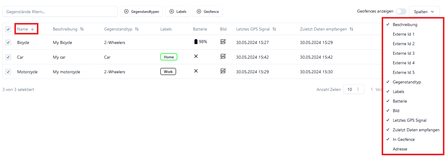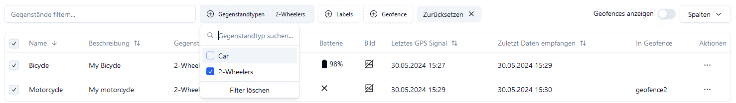 Die Tabellen bieten verschiedene Filtermöglichkeiten. Hier am Beispiel der Gegenstandtabelle bietet es die Möglichkeit die Tabelle nach Gegenstandtypen, Labels und/oder Geofence zu Filtern. Filter können beliebig kombiniert werden. Ausserdem gibt es einen Textfilter, bei welchem man einfach nach dem Namen oder der Beschreibung in der Tabelle filtern kann. Sobald mind. 1 Filter ausgewählt ist erscheint der “Zurücksetzen” Button mit welchem alle Filter gelöscht werden können.