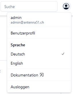 Beim Benutzermenu kann die Systemsprache (Deutsch oder Englisch) eingestellt werden. Ausserdem bietet es einen Link auf das Benutzerprofil und die Dokumentation.